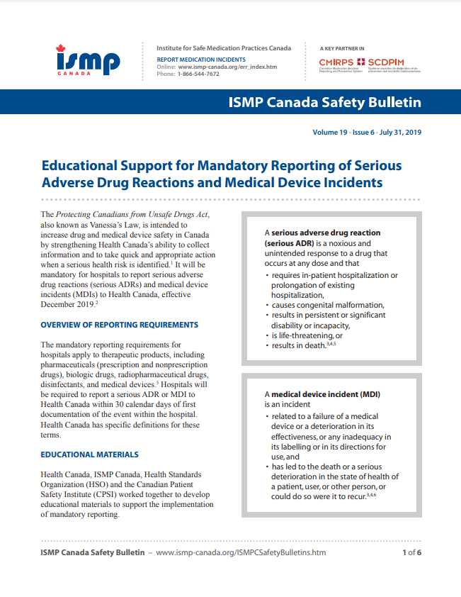The Protecting Canadians from Unsafe Drugs Act, also known as Vanessa’s Law, is intended to increase drug and medical device safety in Canada by strengthening Health Canada’s ability to collect information and to take quick and appropriate action when a serious health risk is identified.1 It will be mandatory for hospitals to report serious adverse drug reactions (serious ADRs) and medical device incidents (MDIs) to Health Canada, effective December 2019.2