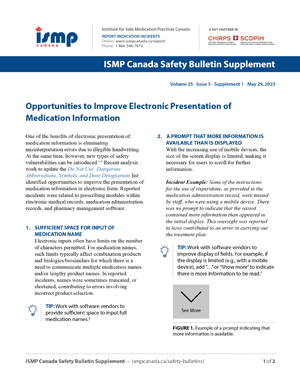 This supplement describes identified opportunities to improve electronic presentation of medication information. Reported incidents were related to prescribing modules within electronic medical records, medication administration records, and pharmacy management software.