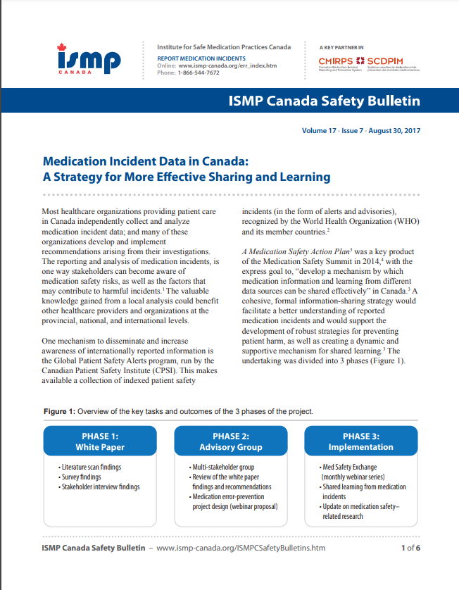 Most healthcare organizations providing patient care in Canada independently collect and analyze medication incident data; and many of these organizations develop and implement recommendations arising from their investigations. The reporting and analysis of medication incidents, is one way stakeholders can become aware of medication safety risks, as well as the factors that may contribute to harmful incidents.1 The valuable knowledge gained from a local analysis could benefit other healthcare providers and organizations at the provincial, national, and international levels.