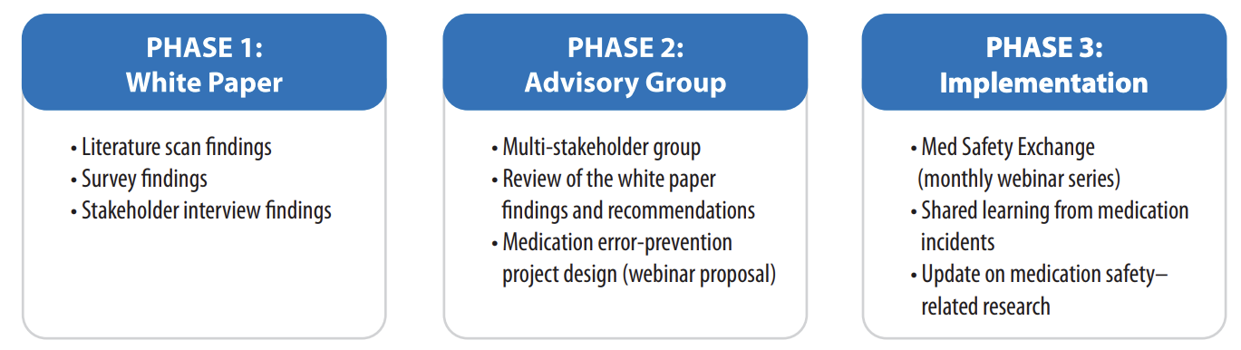 A Medication Safety Action Plan3 was a key product of the Medication Safety Summit in 2014,4 with the express goal to, “develop a mechanism by which medication information and learning from different data sources can be shared effectively” in Canada.3 A cohesive, formal information-sharing strategy would facilitate a better understanding of reported medication incidents and would support the development of robust strategies for preventing patient harm, as well as creating a dynamic and supportive mechanism for shared learning.3 The undertaking was divided into 3 phases (Figure 1).