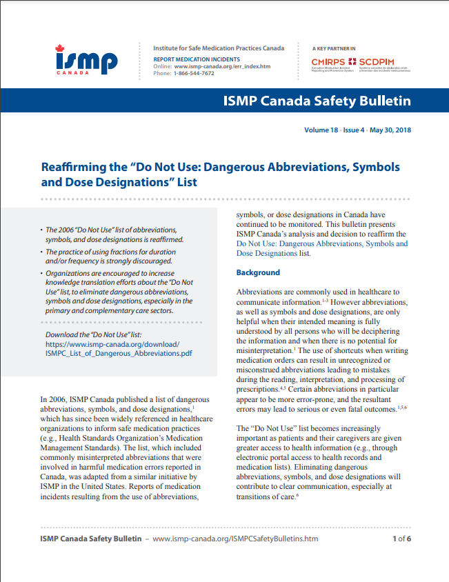 In 2006, ISMP Canada published a list of dangerous abbreviations, symbols, and dose designations,1 which has since been widely referenced in healthcare organizations to inform safe medication practices (e.g., Health Standards Organization’s Medication Management Standards). The list, which included commonly misinterpreted abbreviations that were involved in harmful medication errors reported in Canada, was adapted from a similar initiative by ISMP in the United States. Reports of medication incidents resulting from the use of abbreviations, symbols, or dose designations in Canada have continued to be monitored. This bulletin presents ISMP Canada’s analysis and decision to reaffirm the Do Not Use: Dangerous Abbreviations, Symbols and Dose Designations list.