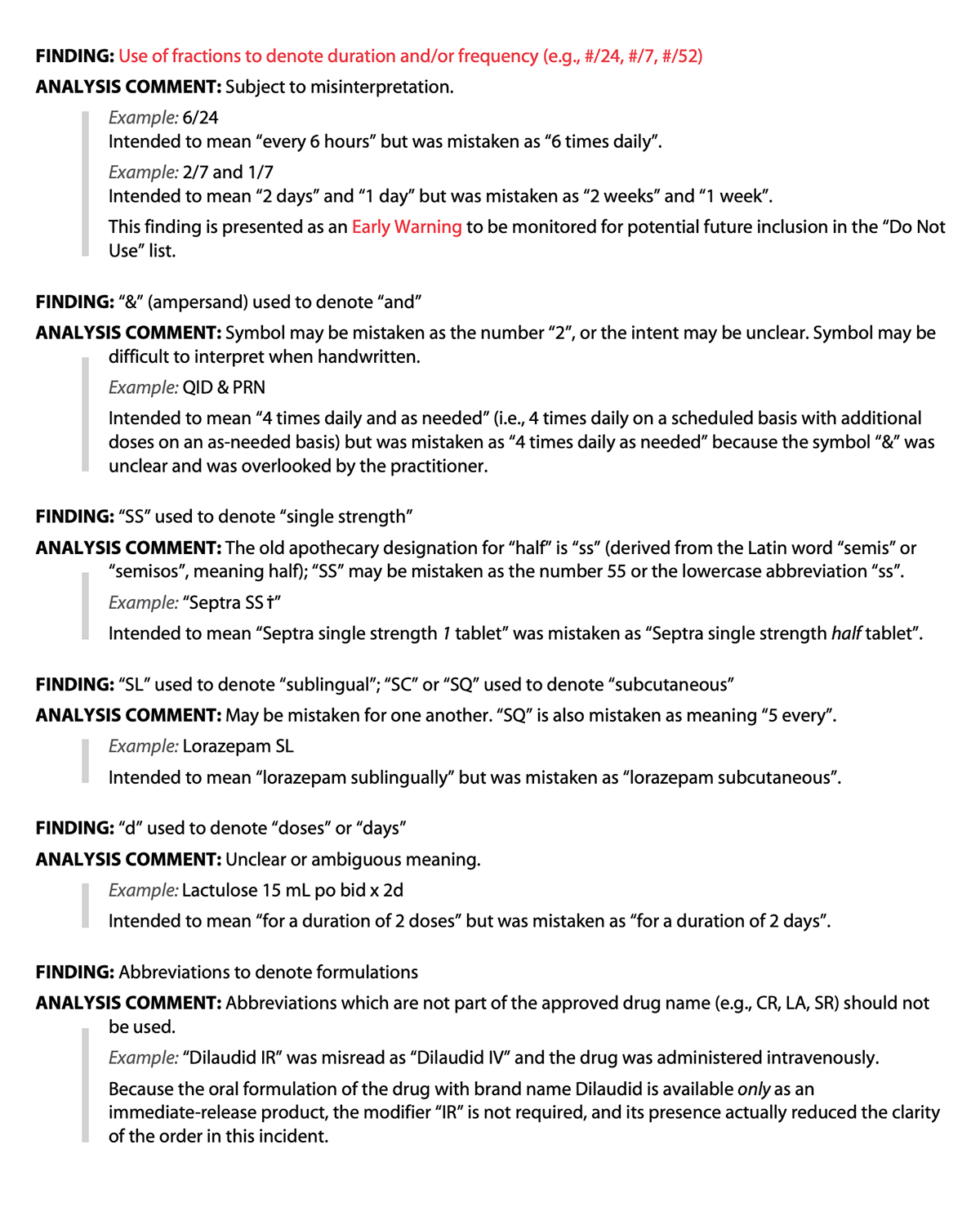 Recommendation: the practice of using fractions for duration and/or frequency is discouraged. The analysis identified incidents resulting in patient harm associated with the use of fractions to denote duration and/or frequency. This finding is presented as an Early Warning to be monitored for potential future inclusion in the “Do Not Use” list.