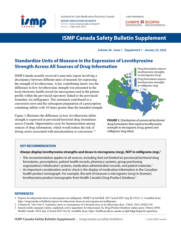 ISMP Canada recently received a near-miss report involving a discrepancy between different units of measure for expressing the strength of levothyroxine. Opportunities exist for harmonization among sources of drug information, which would reduce the risk of dosing errors associated with miscalculation or conversion.