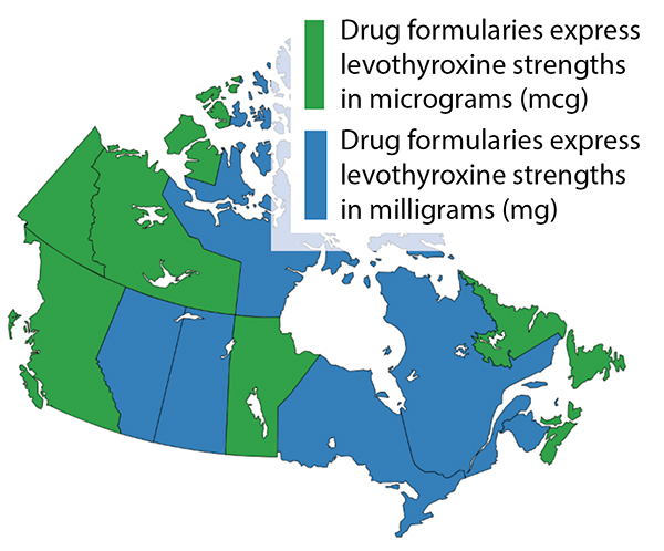 Figure 1 illustrates the difference in how levothyroxine tablet strength is expressed in provincial/territorial drug formularies across Canada. Opportunities exist for harmonization among sources of drug information, which would reduce the risk of dosing errors associated with miscalculation or conversion.1,2