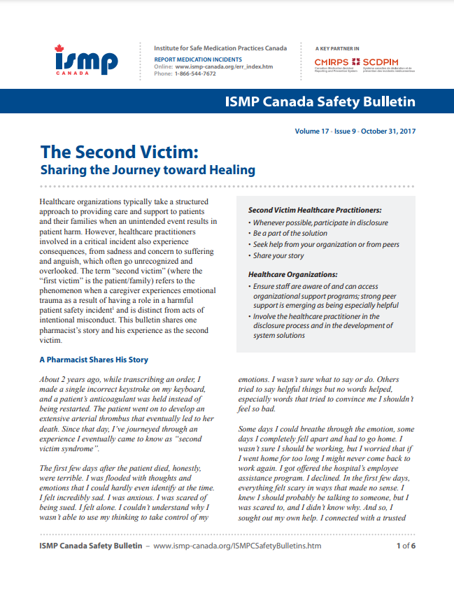 Healthcare organizations typically take a structured approach to providing care and support to patients and their families when an unintended event results in patient harm. However, healthcare practitioners involved in a critical incident also experience consequences, from sadness and concern to suffering and anguish, which often go unrecognized and overlooked. The term “second victim” (where the “first victim” is the patient/family) refers to the phenomenon when a caregiver experiences emotional trauma as a result of having a role in a harmful patient safety incident1 and is distinct from acts of intentional misconduct. This bulletin shares one pharmacist’s story and his experience as the second victim.